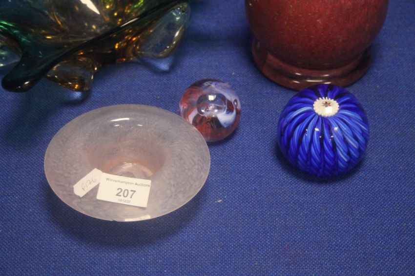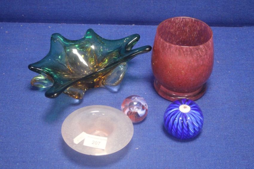 A COLLECTION OF ASSORTED COLOURED GLASS TO INCLUDE 2 GLASS PAPER WEIGHTS, A GLASS VASE ETC