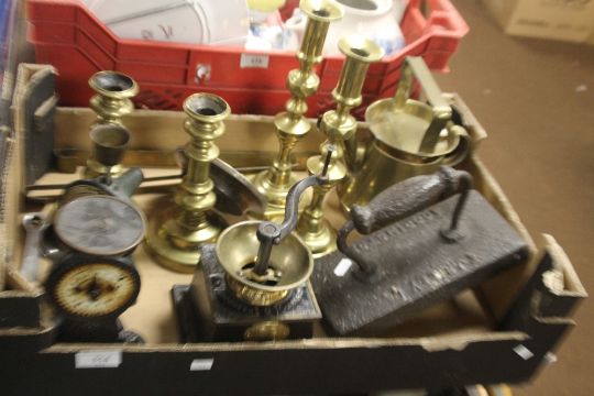 A TRAY OF METALWARE TO INCLUDE A COFFEE GRINDER ETC