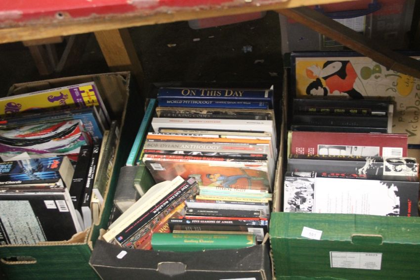 THREE TRAYS OF BOOKS TO INCLUDE MYTHOLOGY, POP MUSIC, SCIENCE FICTION ETC (TRAYS NOT INCLUDED)