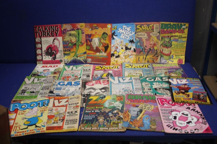 A SELECTION OF COMICS TO INCLUDE BRAIN DAMAGE, SMUT, MAD, GAS SQUAD, VIZ ETC