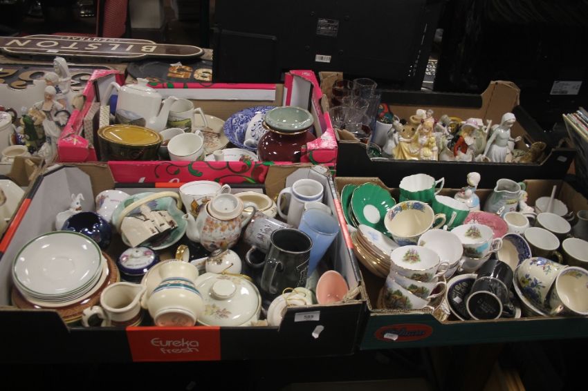 FOUR TRAYS OF CHINA AND GLASSWARE TO INCLUDE ORNAMENTS, VASES, COFFEE POTS MUGS ETC (TRAYS NOT INCLUDED)