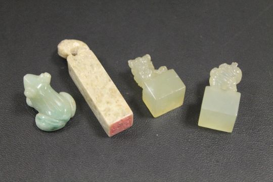 TWO MINIATURE MODERN JADE DOGS OF FO, TOGETHER WITH A CARVED HARDSTONE SEAL AND A MINIATURE FROG (4)