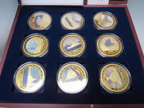 A COLLECTION OF MOST FAMOUS BATTLESHIPS COINS, USS Iowa, Bismarck, Turpitz, Yamato, etc., nine in a wooden case with certificate