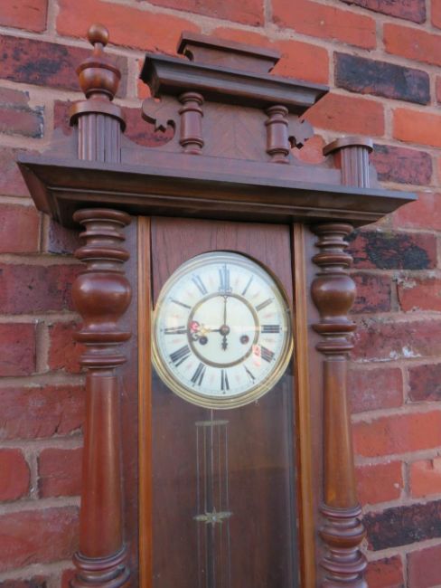 A GUSTAV BECKER CHIME STRIKE VIENNA WALL CLOCK, the case with mahogany fronted veneers, turned pillars and crown, the enamelled dial with steel filigree hands, striking on a long single chime bar, H 120 cm