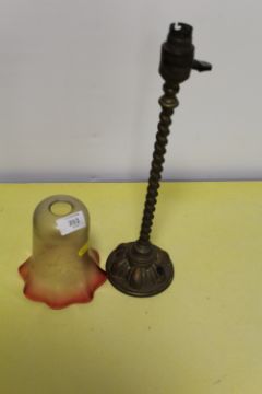AN ANTIQUE BRASS TABLE LAMP WITH CRANBERRY SHADE
