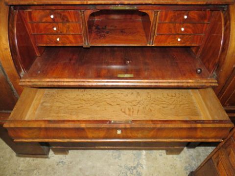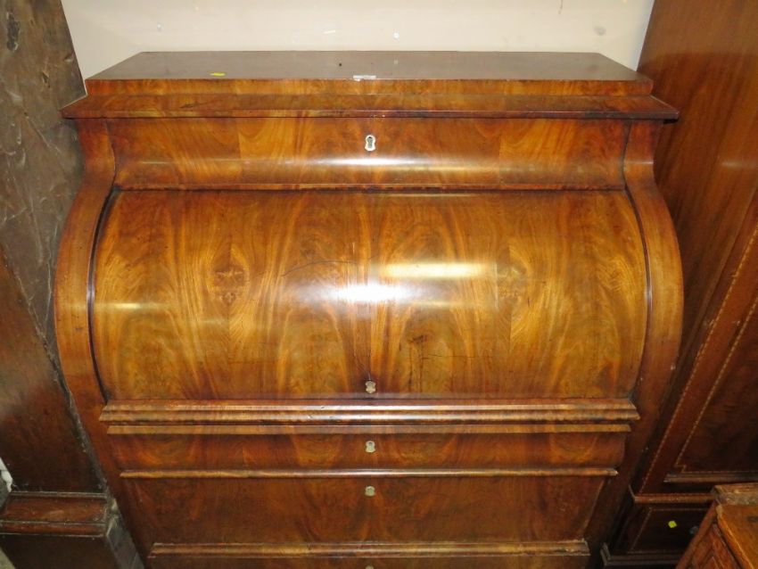 A 19TH CENTURY BIEDERMEIER STYLE MAHOGANY CYLINDER BUREAU HAVING A FITTED INTERIOR, the pull-out writing surface above three drawers, a further drawer above the cylinder front, H 122, W 106 cm S/D