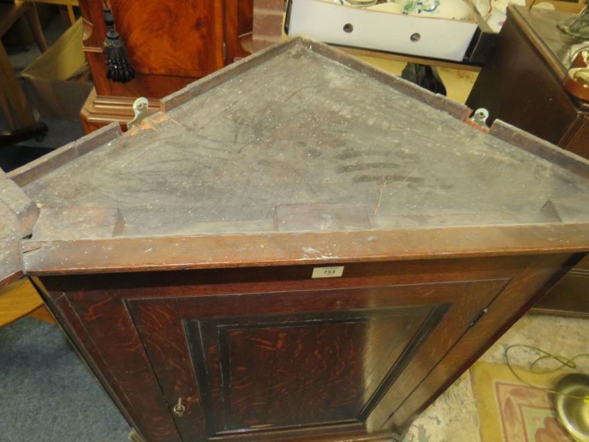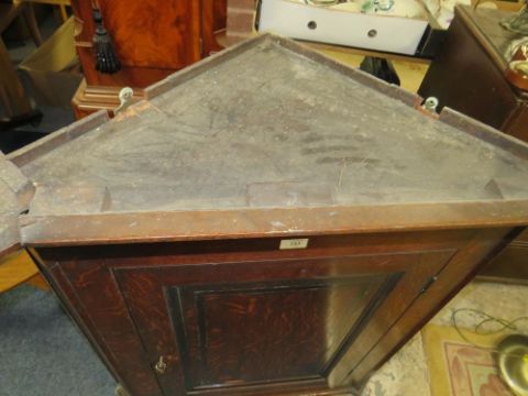 AN ANTIQUE OAK HANGING CORNER CUPBOARD