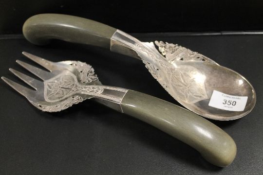 A PAIR OF CONTINENTAL WHITE METAL ORNATE SERVERS WITH HORN HANDLES A/F