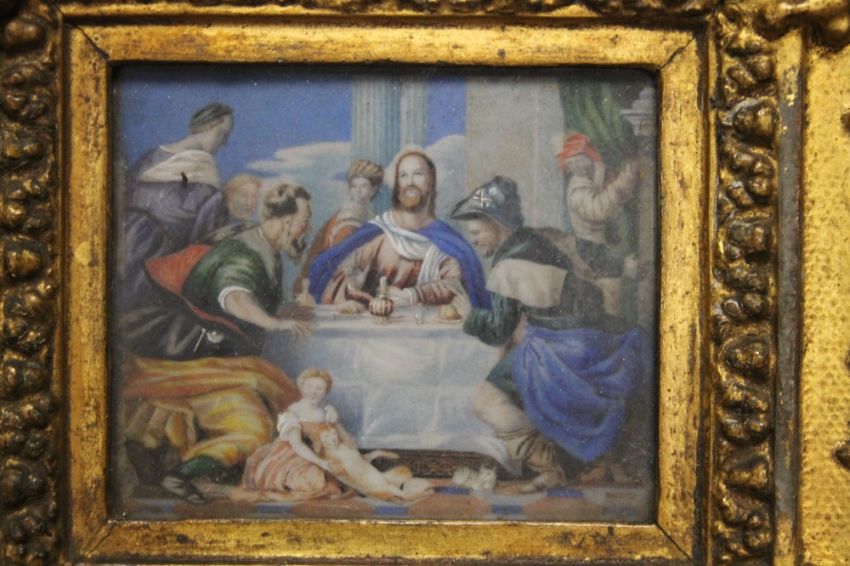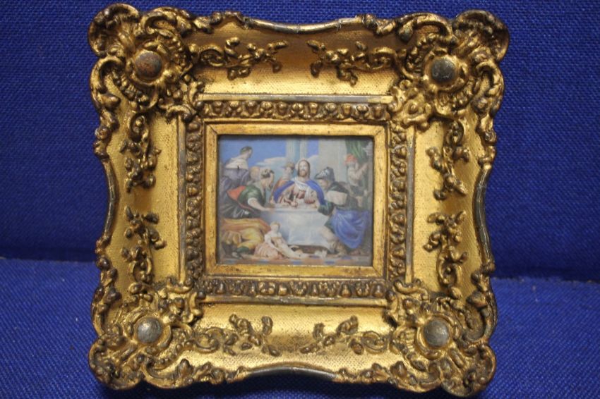 A GILT FRAMED ECCLESIASTICAL OIL ON BOARD 20 CM X 20 CM
