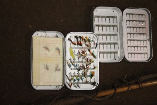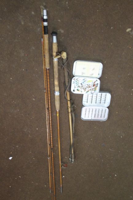 TWO VINTAGE FISHING RODS AND A WHIP ETC