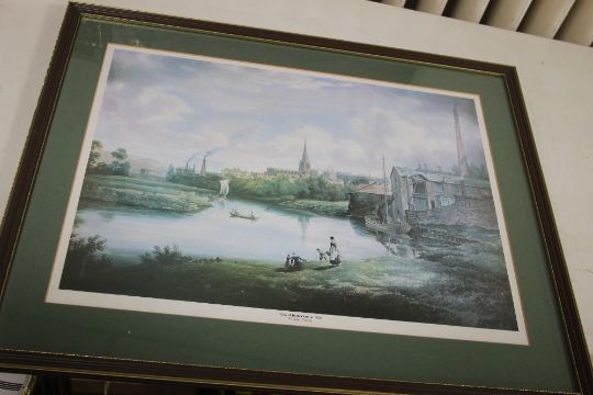 A FRAMED AND GLAZED PRINT TITLED "A VIEW IN ROTHERHAM IN 1828" 66 CM X 54 CM