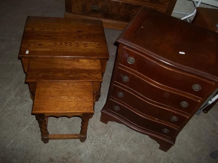 A SMALL SERPENTINE FRONTED 4 DRAWER CHEST AND AN OAK NEST OF TABLES