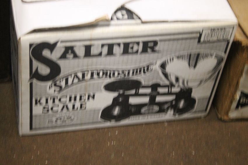 A BOXED SET OF SALTER SCALES TOGETHER WITH A PROJECTOR