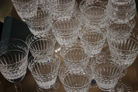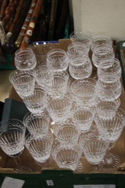 A TRAY OF CUT GLASS DRINKING GLASSES (TRAY NOT INCLUDED)