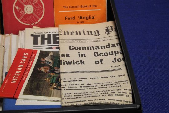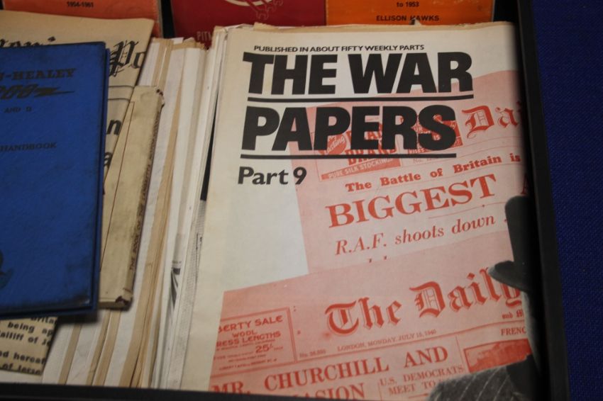 A CASE CONTAINING A COLLECTION OF CAR HAND BOOKS AND A QUANTITY OF NEWSPAPERS
