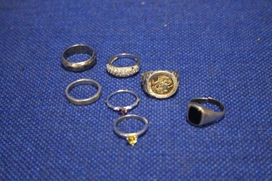 SEVEN SILVER AND WHILE METAL RINGS (7)