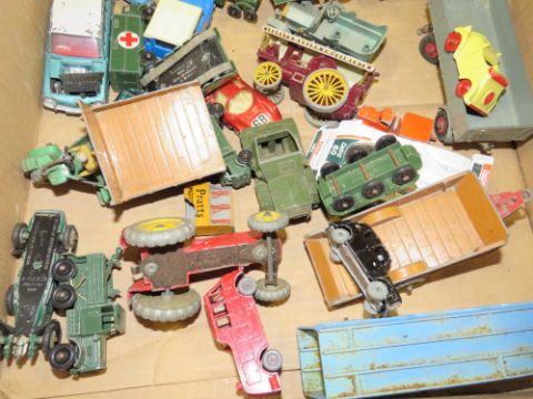 A TRAY OF ASSORTED DIECAST VEHICLES TO INC DINKY TRACTOR, LESNEY ETC