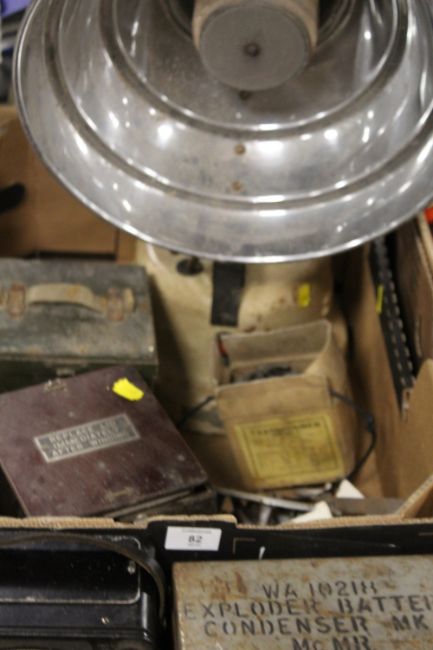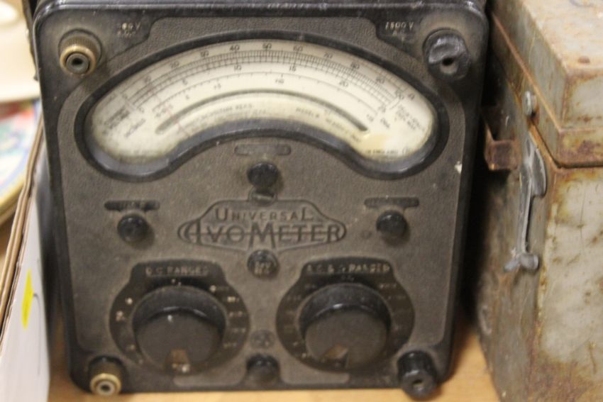 A TRAY OF VINTAGE ELECTRICALS ETC TO INCLUDE A BAKELITE AVOMETER, HEAT LAMP, ETC
