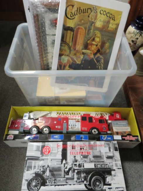 A TELEMANIA FIRE ENGINE PUSH BUTTON TELEPHONE TOGETHER WITH AN INTERACTIVE FIRE ENGINE, WOODEN WALKING PUPPET AND SELECTION OF FIRE ENGINE PICTURES ETC AND AN ELIGOR TRACTION AVANT CITROEN