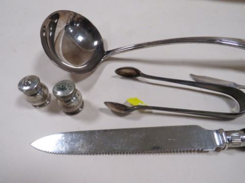 A MAPPIN & WEBB SILVER PLATED LADLE TOGETHER WITH A HORN HANDLED CARVING KNIFE ETC