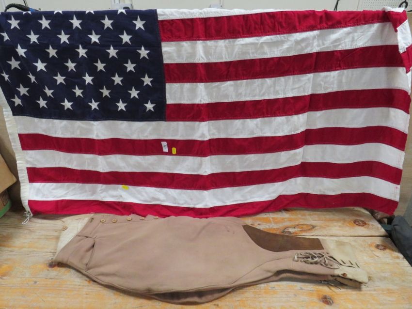 AN AMERICAN FLAG TOGETHER WITH A PAIR OF VINTAGE JODHPURS (2)
