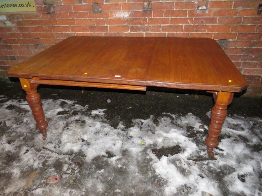 AN EDWARDIAN OAK WIND-OUT DINING TABLE WITH ONE SPARE LEAF