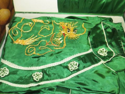 A BOXED VINTAGE ORIENTAL SATIN PYJAMAS AND SLIPPER SET