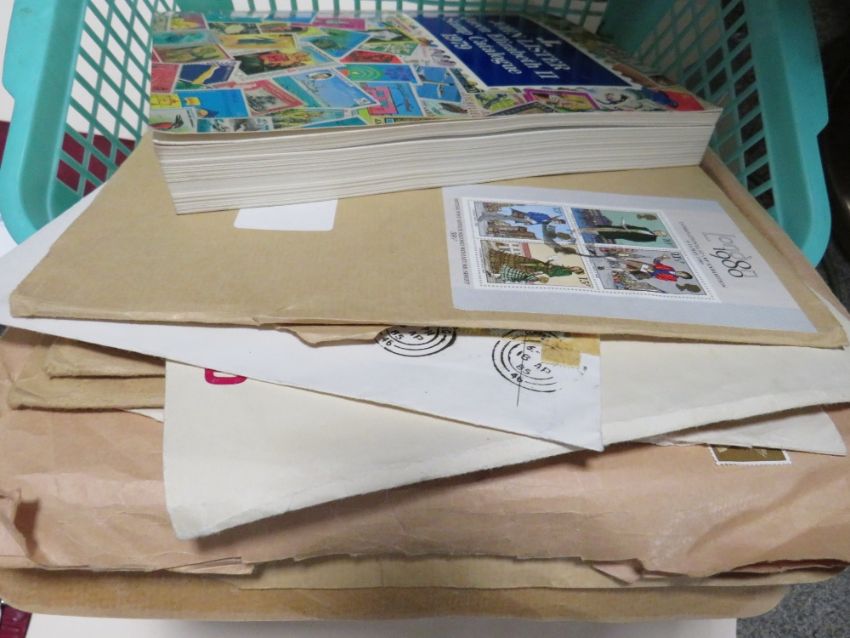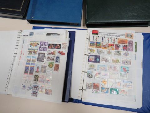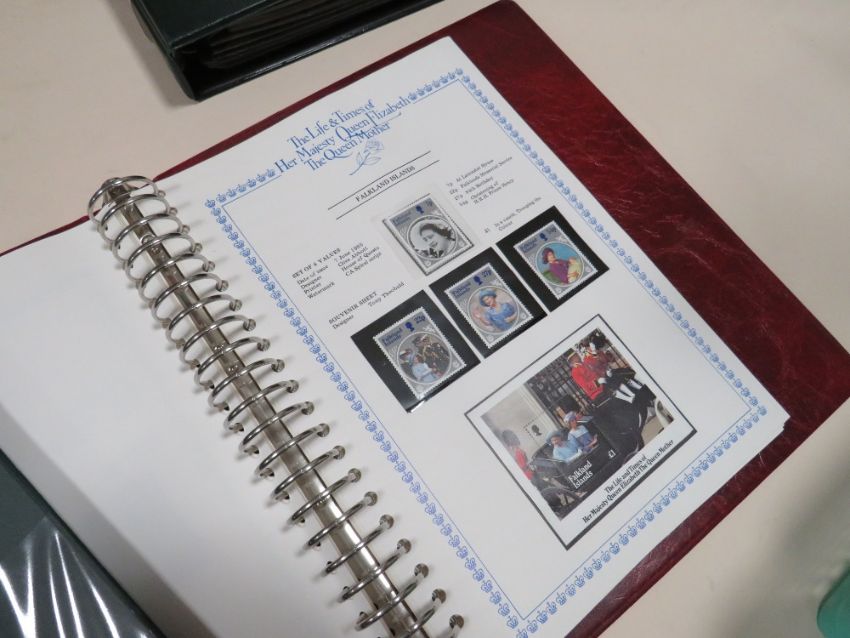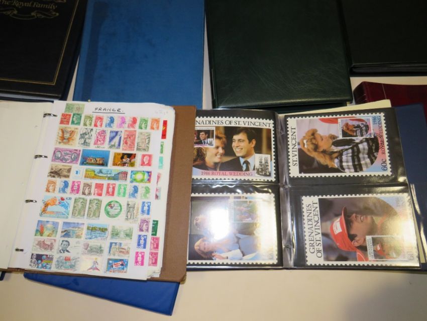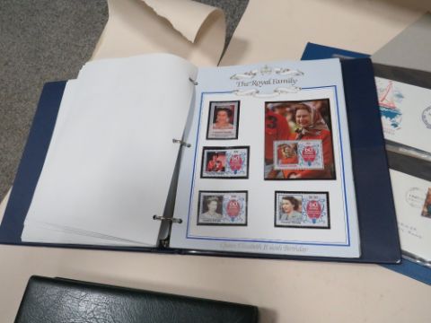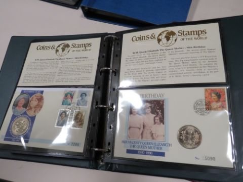 A COLLECTION OF STAMP ALBUMS TO INCLUDE FIRST DAY COVERS, WORLDWIDE AND COMMEMORATIVE EXAMPLES PLUS A FOLDER OF COINS AND STAMPS OF THE WORLD