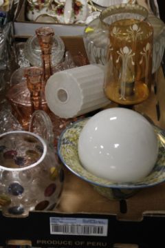 TWO TRAYS OF ASSORTED GLASSWARE TO INCLUDE CARNIVAL GLASS, RETRO AND VINTAGE GLASS LAMP SHADES, DRESSING TABLE SETS ETC