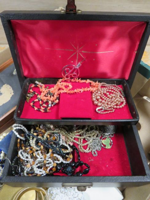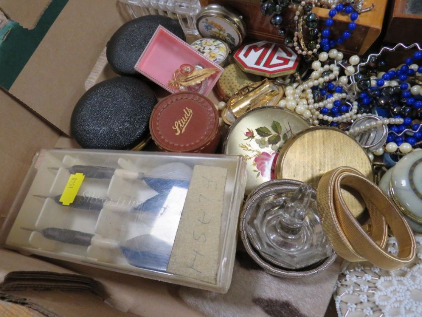 A TRAY OF VINTAGE AND MODERN COSTUME JEWELLERY AND COLLECTABLES ETC