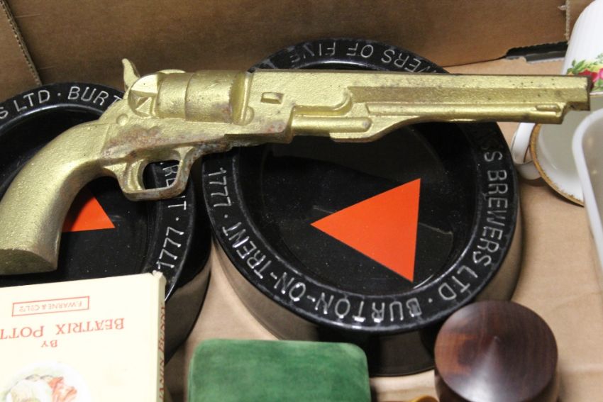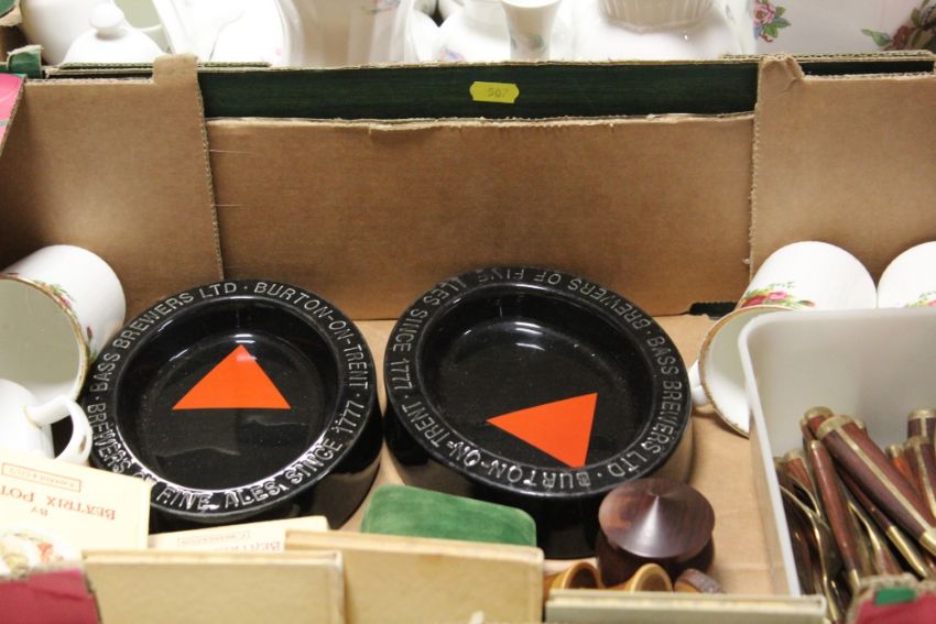 A TRAY OF ASSORTED COLLECTABLES TO INCLUDE, BEATRIX POTTER BOOKS, BRASS CUTLERY, ROYAL ALBERT MUGS, WADE BASS ASHTRAYS ETC