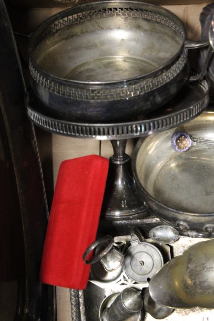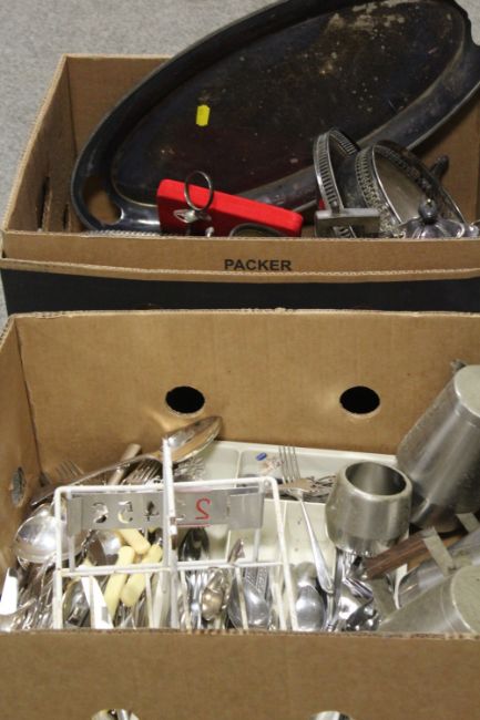 TWO TRAYS OF ASSORTED METALWARE AND FLATWARE TO INCLUDE SILVER PLATED COMPORT, SERVING TRAY ETC