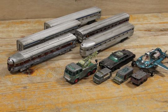 A SMALL COLLECTION OF VINTAGE CONTINENTAL TRAINS AND CARRIAGES PLUS A SELECTION OF DIE CAST VEHICLES TO INC DINKY, CORGI ETC
