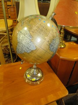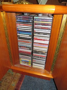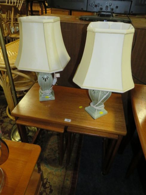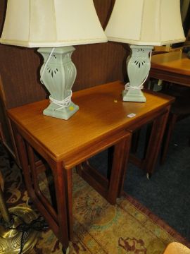 A MID CENTURY TEAK NEST OF TABLES, CD CABINET AND CONTENTS, OCCASIONAL TABLE , TWO STANDARD LAMPS, GLOBE AND STOOL ETC