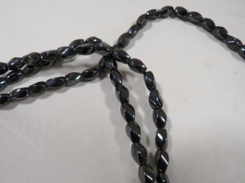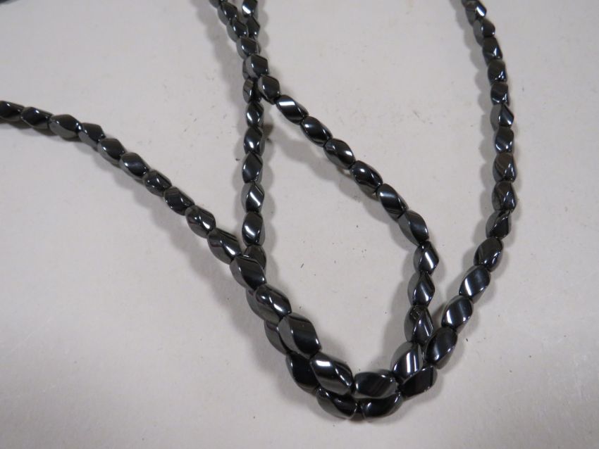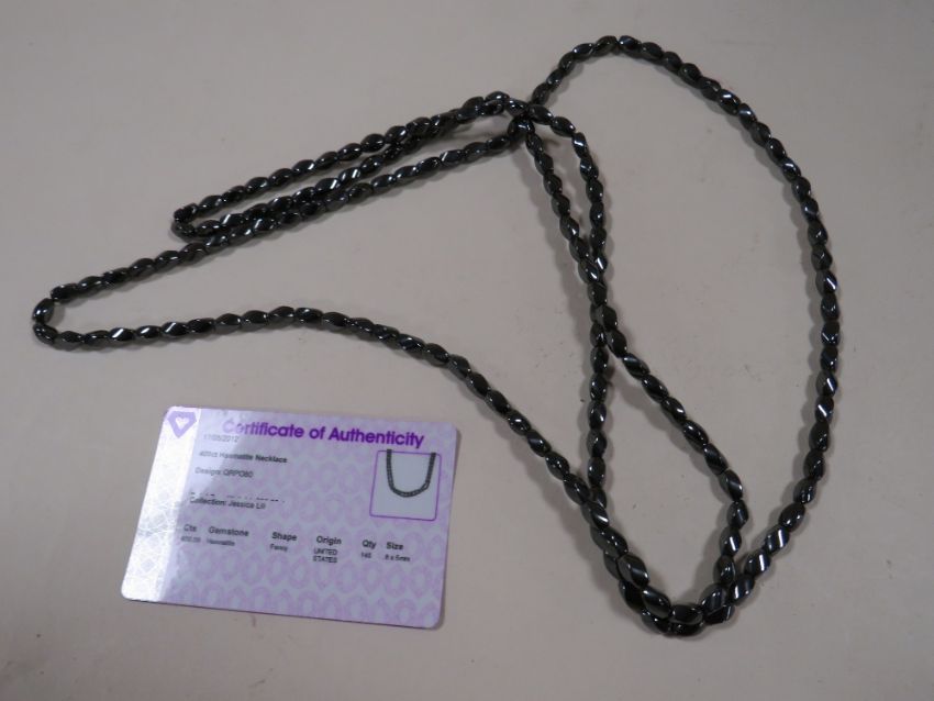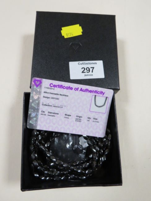 A BOXED LONG LENGTH HAEMATITE SINGLE STRAND BEAD NECKLACE WITH C.O.A.