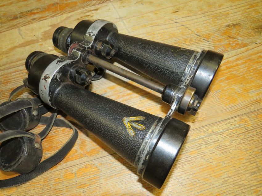 A PAIR OF CASED MILITARY BINOCULARS, SERIAL NO 63777 WITH BROAD ARROW MARK