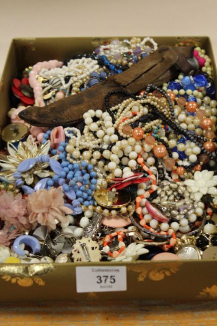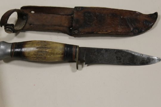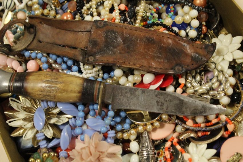 A VINTAGE BONE HANDLED KNIFE WITH SHEATH PLUS A COLLECTION OF VINTAGE COSTUME JEWELLERY
