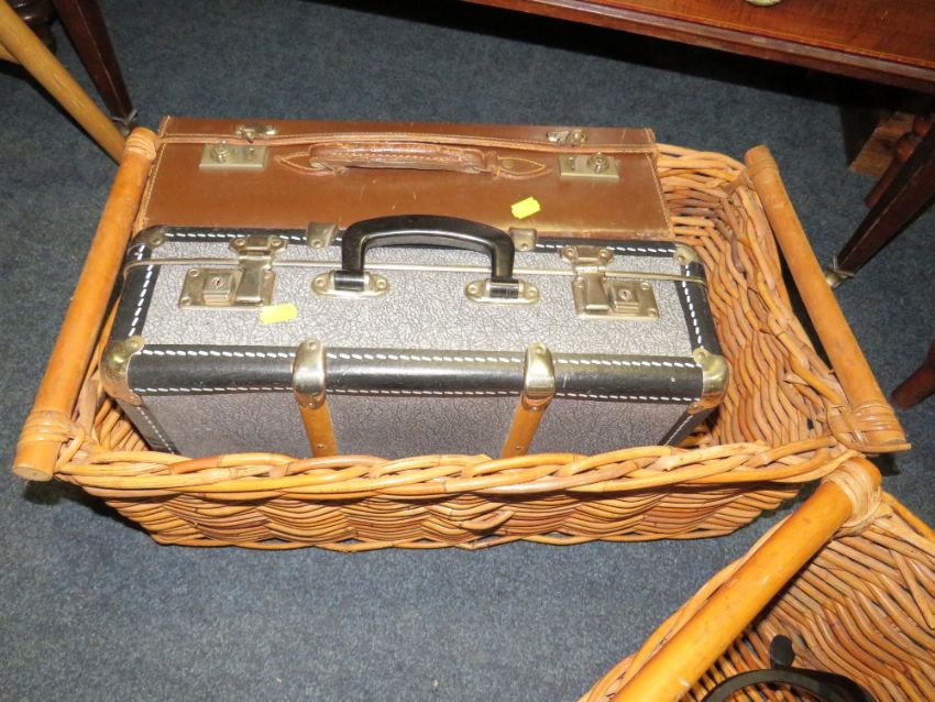 TWO RECTANGULAR BASKETS, TABLE LAMP AND CANDLE STAND (4)