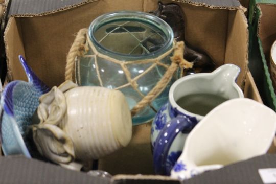 TWO TRAYS OF ASSORTED CERAMICS AND COLLECTABLES TO INCLUDE ROYAL WINTON, WEDGWOOD QUEENS' WARE CHRISTMAS TIME PLATES ROYAL WORCESTER CAKE PLATE ETC
