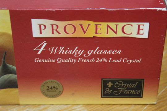 TWO BOXES OF ASSORTED GLASSWARE TO INCLUDE STUDIO GLASS, RETRO EXAMPLES, BOXED DRINKING GLASSES ETC
