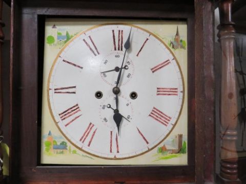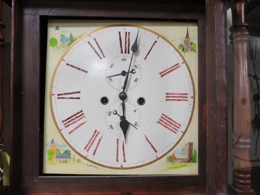 A NINETEENTH CENTURY OAK AND MAHOGANY LONGCASE CLOCK, with eight day movement, the painted face with subsidiary dated and seconds dials, two weights and pendulum, H 225 cm