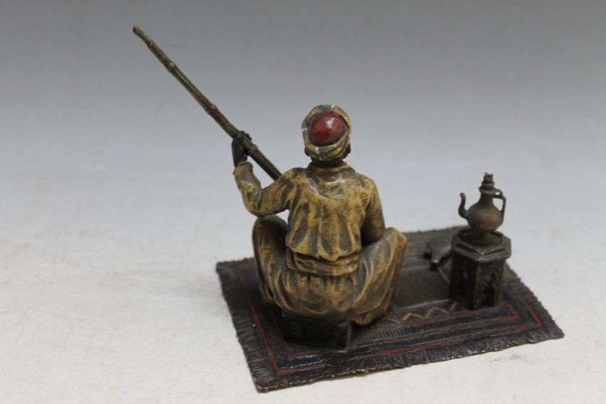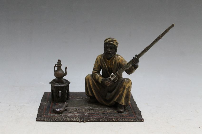 AN AUSTRIAN STYLE COLD PAINTED BRONZE OF AN ARAB GENTLEMAN SEATED ON A CARPET WITH A GUN, W 15 cm