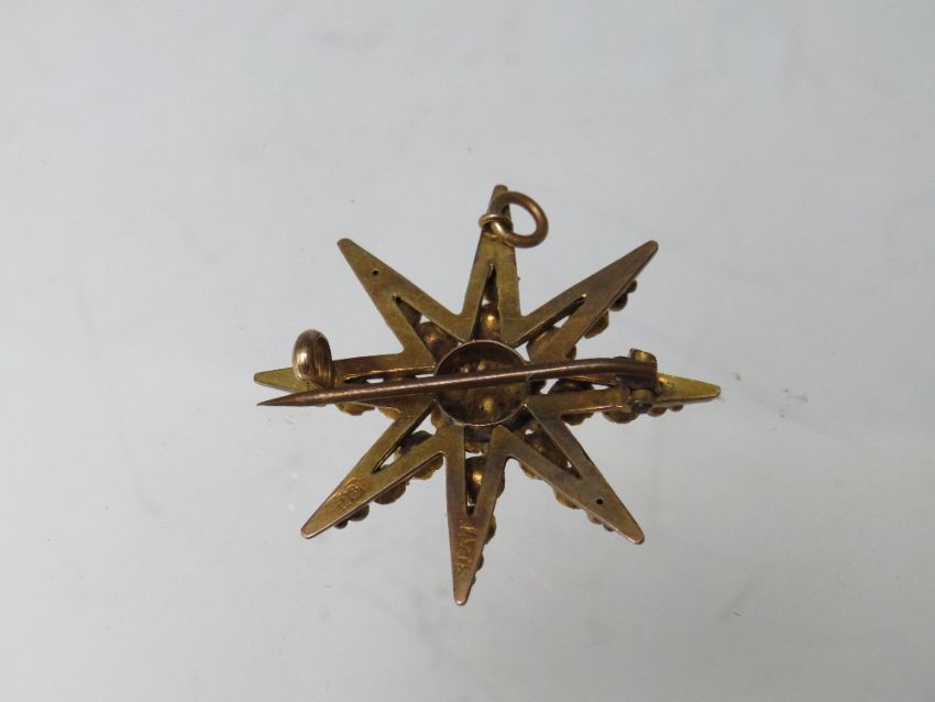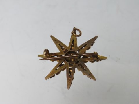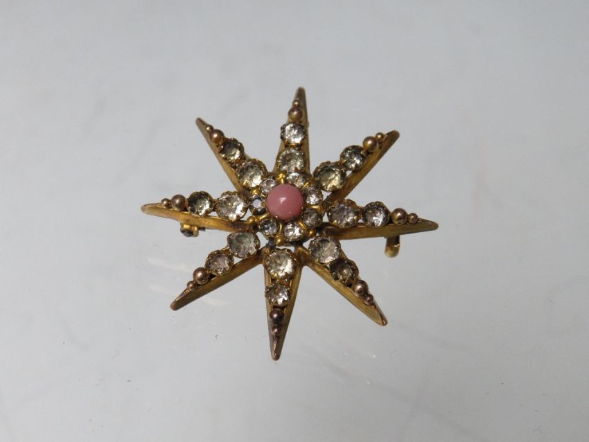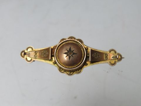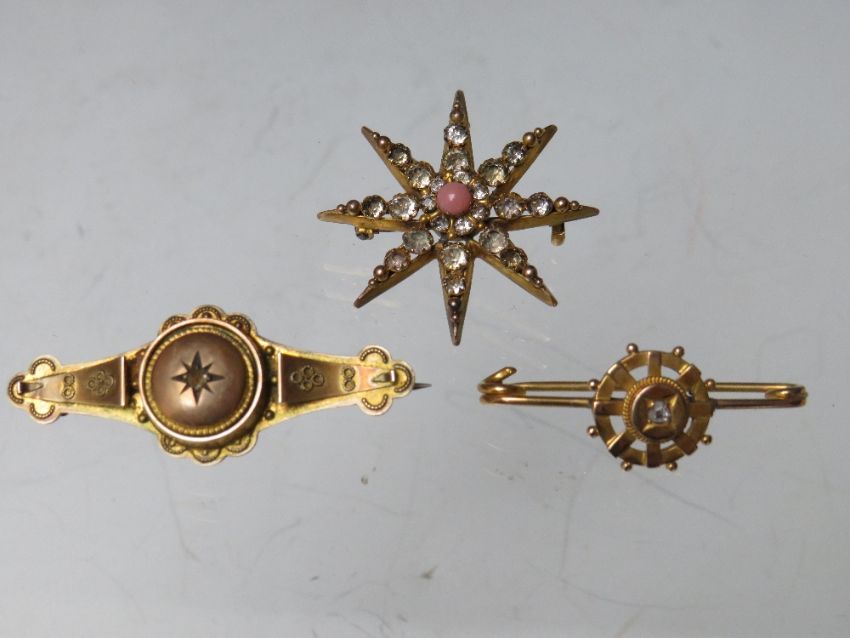 A HALLMARKED 9CT GOLD DIAMOND SET BAR BROOCH, together with a starburst style brooch stamped 9ct (combined weight approx 7.6 g) and an unmarked yellow metal diamond set brooch, overall combined weight 10.2 g (3)
