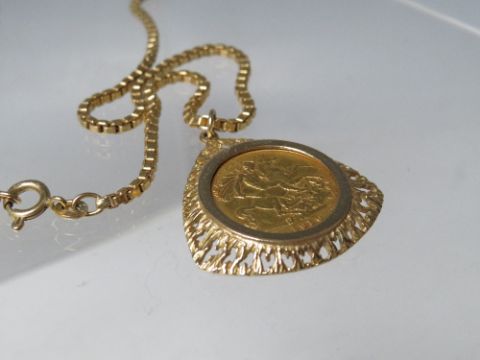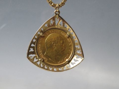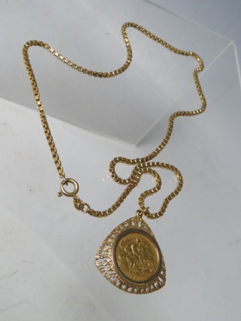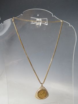 A 1910 EDWARD VII SYDNEY MINT GOLD HALF SOVEREIGN COIN IN 9CT GOLD PENDANT MOUNT, suspended on a 9ct gold box chain, overall weight approximately 13.2 g