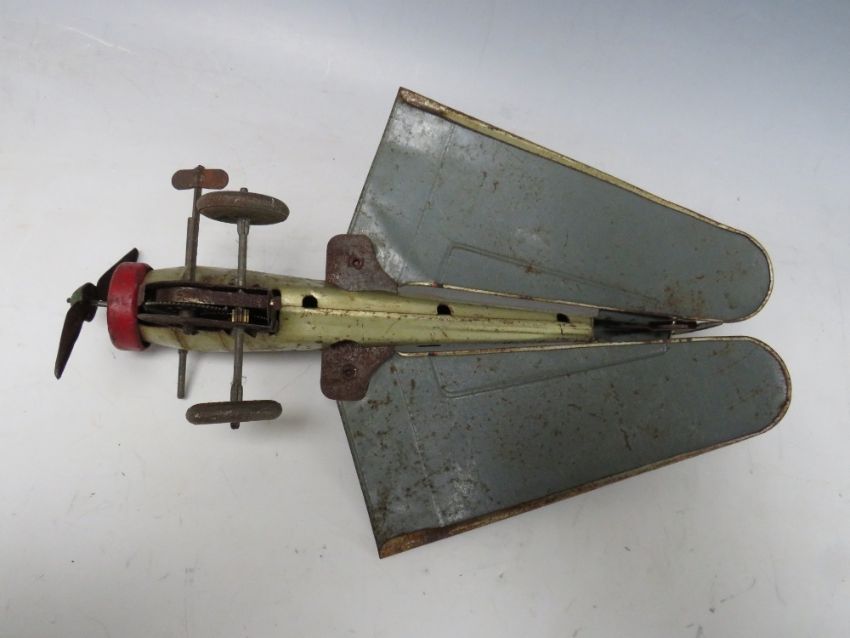 A VINTAGE CLOCKWORK TIN PLATE PROPELLER AEROPLANE, with retractable wings, L 30 cm, W 43 cm with wings extended