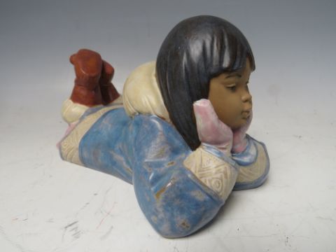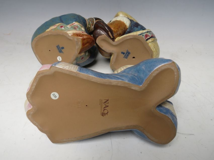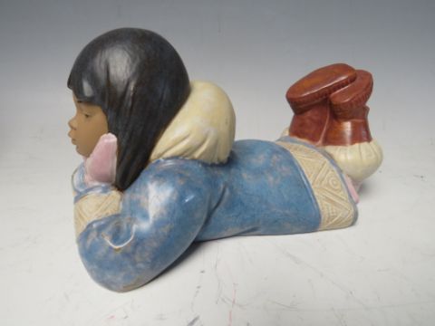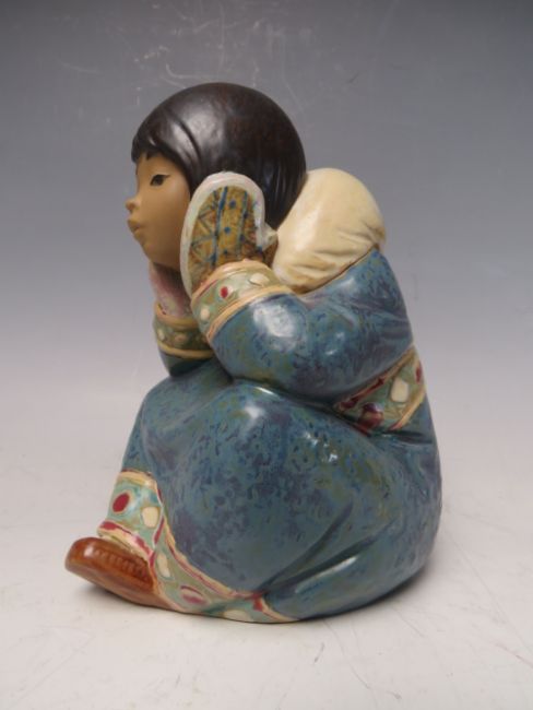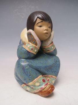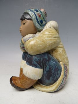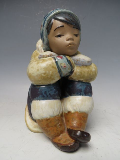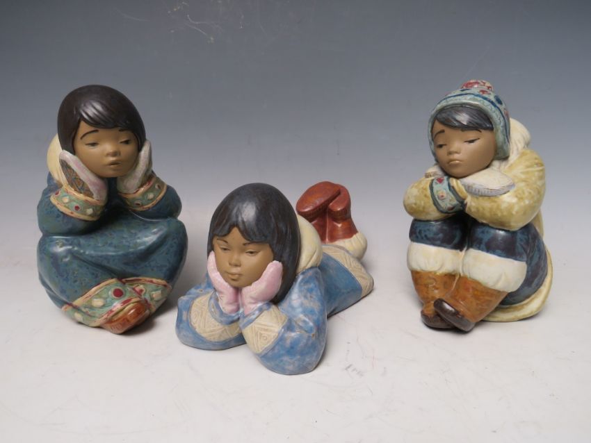 TWO LLADRO SPANISH POTTERY FIGURES, comprising 'Pensive Eskimo Boy' and 'Pensive Eskimo Girl', together with a similar Nao figure (3)