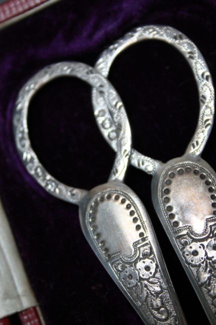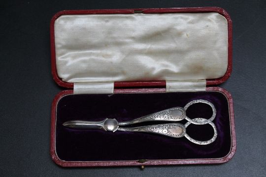 A CASED PAIR OF HALLMARKED SILVER GRAPE SCISSORS BY COOPER BROTHERS - SHEFFIELD 1896, approx weight 56.8g, L 14.5 cm