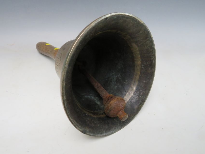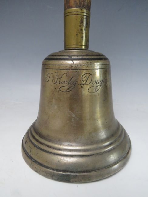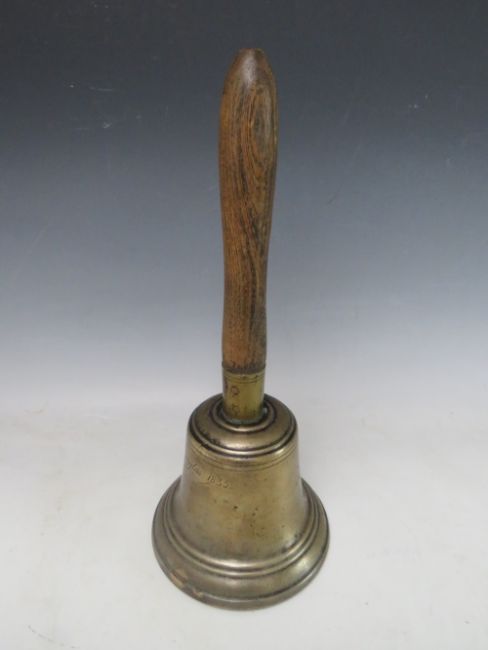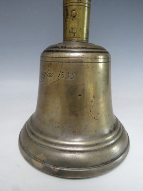 A 19TH CENTURY ISLE OF MAN WOODEN HANDLED HANDBELL, inscribed J. Kewley, Douglas, 1835', overall H 38 cm, base Dia. 16 cm