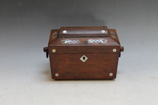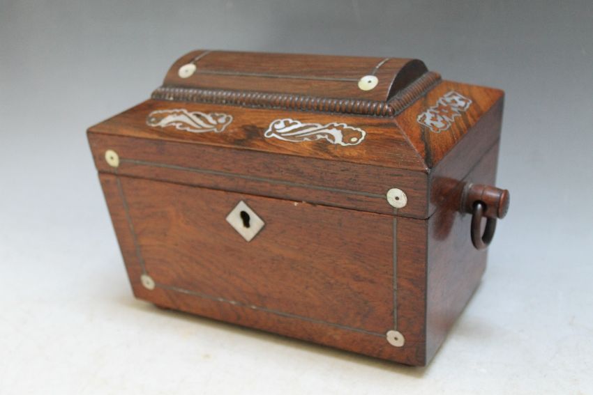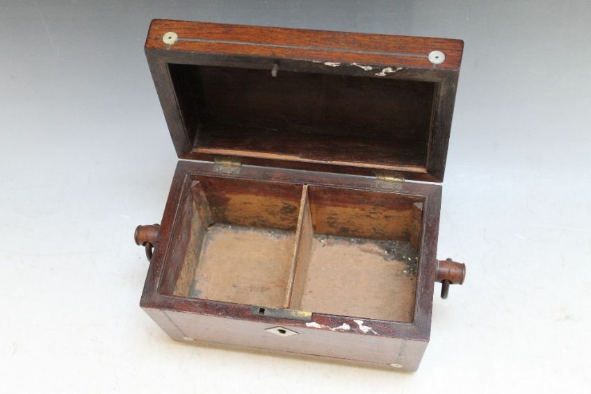 A TREEN INLAID TWO SECTION TEA CADDY, W 23 cm