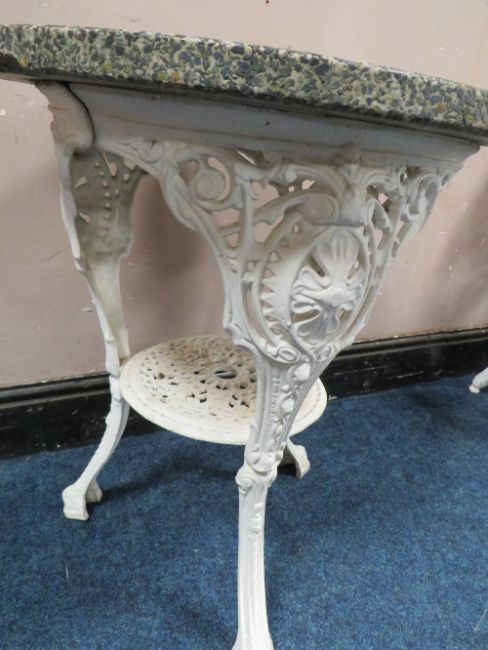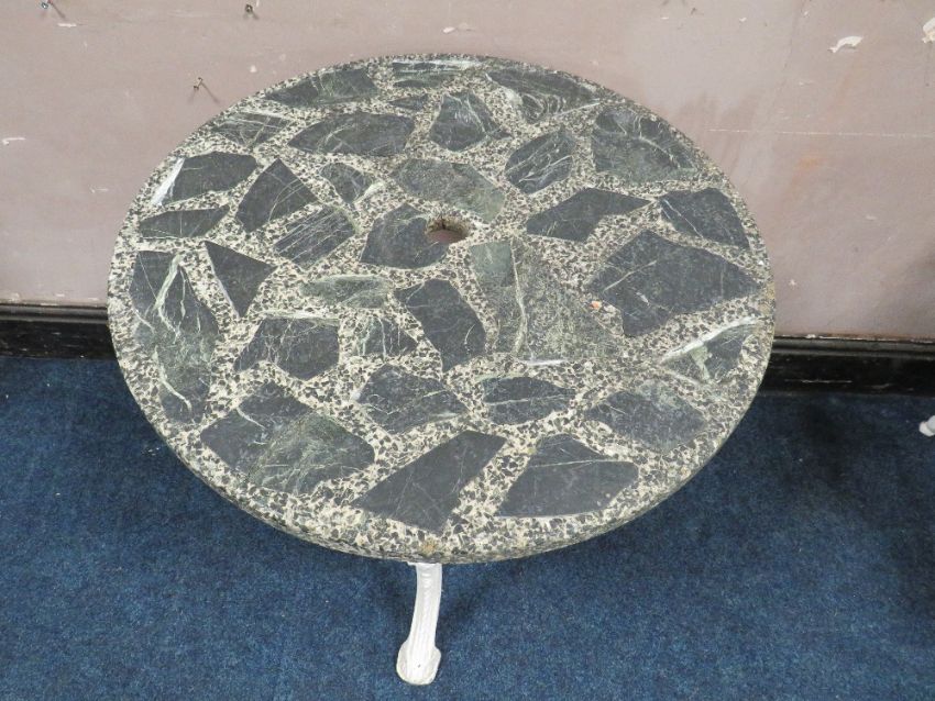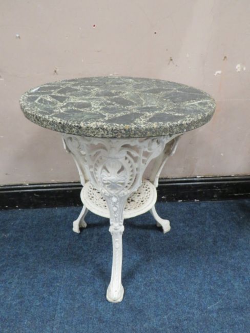 A VICTORIAN STYLE CAST ALUMINIUM PUB STYLE TABLE, with a stone / concrete circular top, H 74 cm, Dia. 60.5 cm